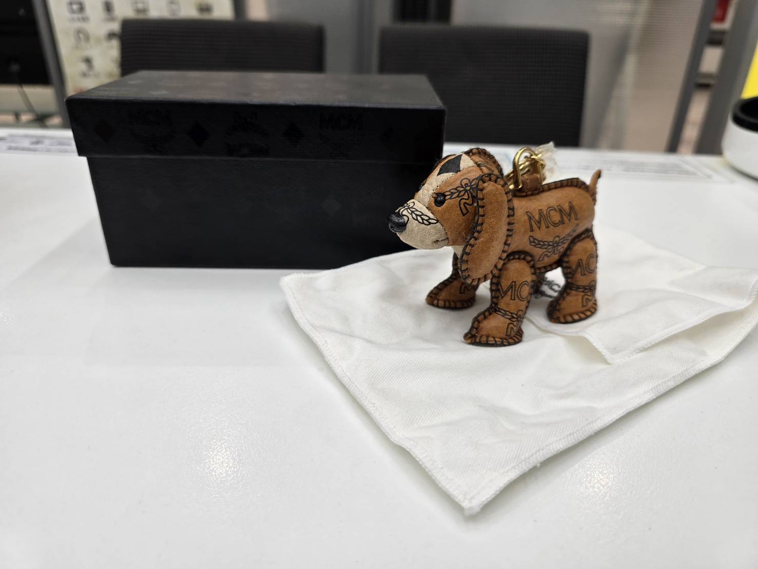 MCMのロゴが散りばめられたかわいい犬のチャームです。